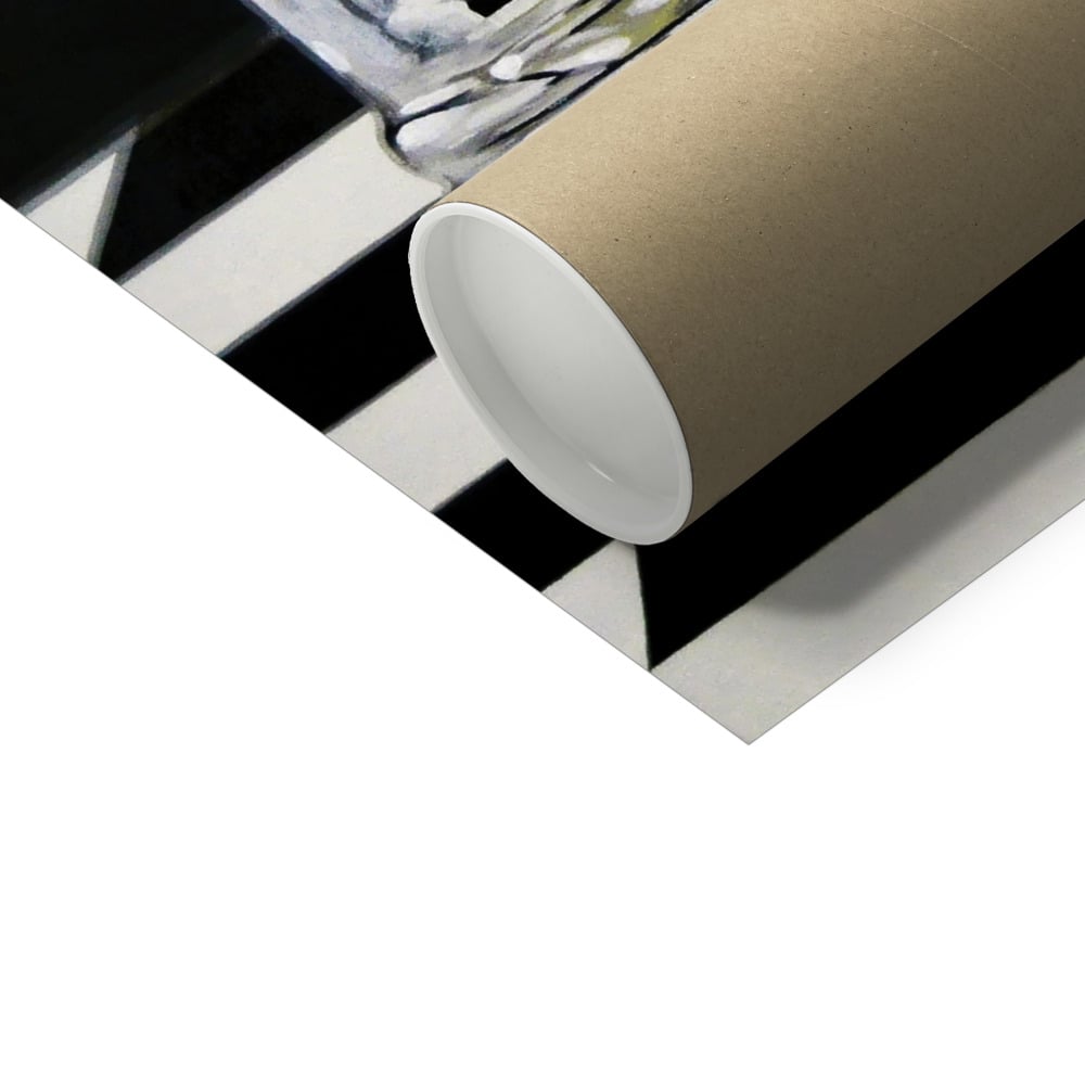 Prints larger than A4 are sent rolled in a cardboard tube. Unpack & flatten with care.